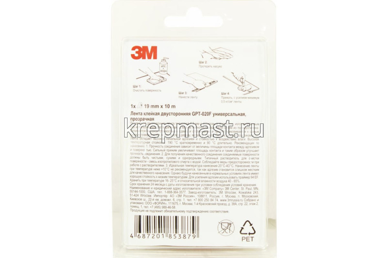 Двусторонняя лента на ПЭТ основе 3М прозрачная 19 мм х 10 м обладает высокой адгезией. С помощью двусторонней ленты можно соединять различные материалы, такие как: дерево, металл, стекло, бумагу, многие пластики и ткани. Изделие подходит для использования и внутри, и снаружи помещений.