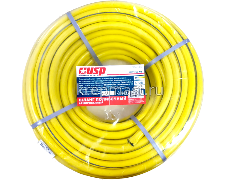 Поливочный 3-слойный армированный шланг USP 1/2"x50 м, желтый подходит для интенсивного ухода за растениями на садовых участках. Благодаря армированному слою, сохраняет свою первоначальную форму.