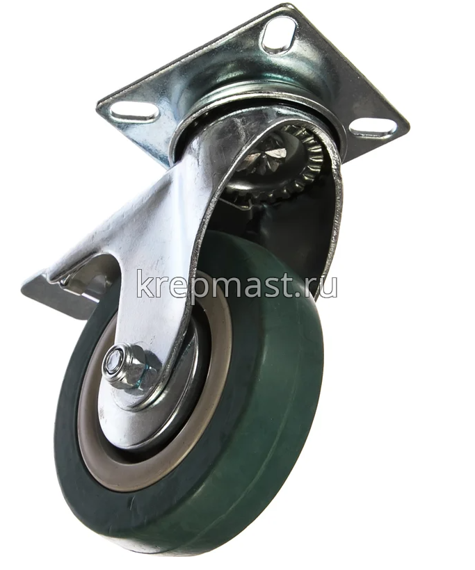 Колесо д. 100 мм ПОВОРОТНОЕ ЗУБР на площадке резина (г/п 100кг) с тормозом предназначено для удобного перемещения тележек и контейнеров легкой и стандартной грузоподъёмности, легковесного оборудования, строительных лесов и прочих конструкций. Применяется на любых типах покрытий. Возможно использование как внутри помещения, так и снаружи. Может использоваться в условиях повышенной влажности и слабых кислот. Колесо выполнено из серой резины, диск из полипропилена. Подшипник – скольжения.