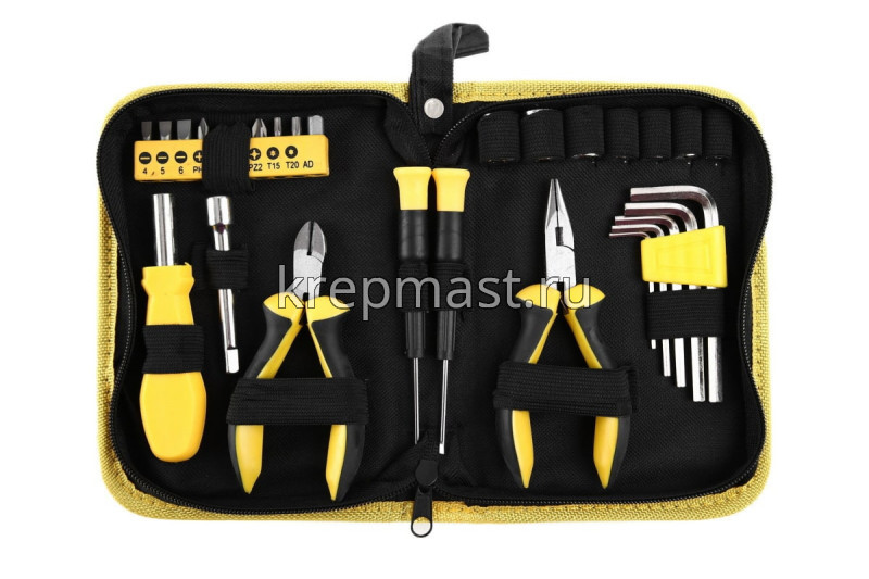 Набор электрика FIT 65137 состоит из 29 предметов - отверток, бит, ключей HEX, пассатижей, адаптера-удлинителя, головок. Предназначен для проведения электромонтажных работ. Все составляющие набора изготовлены из инструментальной стали, поэтому прослужат долго. Комплект поставляется в прочной нейлоновой сумке, что упрощает хранение и транспортировку инструментов.