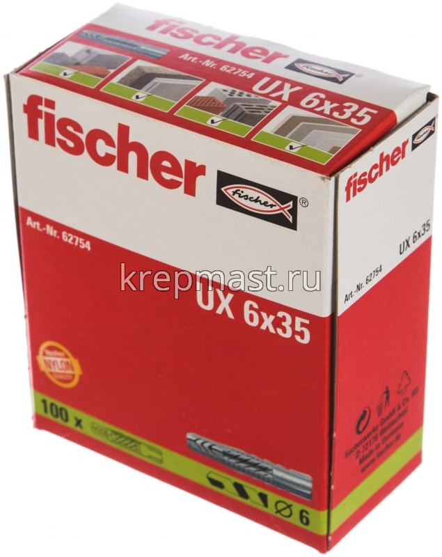 Универсальный дюбель FISCHER UX 6x35 применяется для создания надежных и долговременных креплений, в дальнейшем используемых для подвешивания или фиксации светильников, стенных шкафов, гардеробов, почтовых ящиков, кронштейнов для телевизоров, складных ставней, поручней, световых шахт, а так же для монтажа ванн и унитазов.