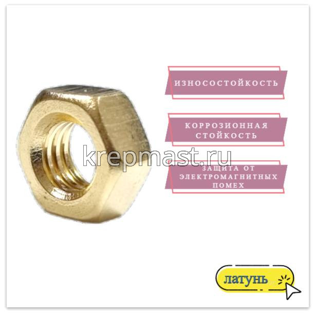 Шестигранная латунная гайка М 6 DIN 934/ ГОСТ 5927 применяется в приборостроении, авиации, атомной промышленности. Латунный крепеж стоек к органическим кислотам и углекислым растворам.