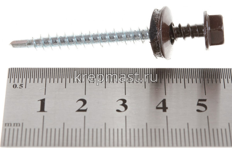 Кровельный саморез окрашенный с шайбой и резиновой прокладкой EPDM DIN 7504 4,8 х 51 по дереву RAL 8017 (цвет шоколадно-коричневый) - представляет из себя саморез с шестигранной головкой, фланцем и резиновой прокладкой для эффективного прижатия листового металла к основанию.