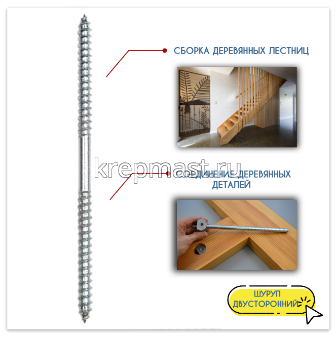 Сантехническая шпилька (двусторонний саморез) М6 х 120 используетя при сборке деревянных лестниц в многоярусных квартирах или загородных домах. С помощью крепежа можно обеспечить прочное, надежное и практически незаметное соединение опорных элементов массивного сооружения. Двусторонний саморез для балясин важно правильно подобрать по длине и диаметру изделия.