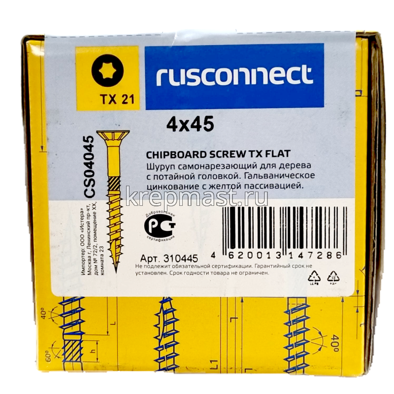 Шуруп с/нарез. для дерева потай 4,0х 45 Тх в интернет-магазине «Мастер Крепежа» по цене 8 руб. Более 43 наименований товаров в наличии в категории Шурупы КОНСТРУКЦИОННЫЕ для дерева. Купить шуруп с/нарез. для дерева потай 4,0х 45 тх в Бугульме выгодно Вы можете on-line на нашем сайте, или отправив заявку по почте, а также по телефону или в пункте выдачи компании г. Казань, ул. Татарстан, 9, магазин "Мастер Крепежа". Доставка по Республике Татарстан и другие регионы РФ.