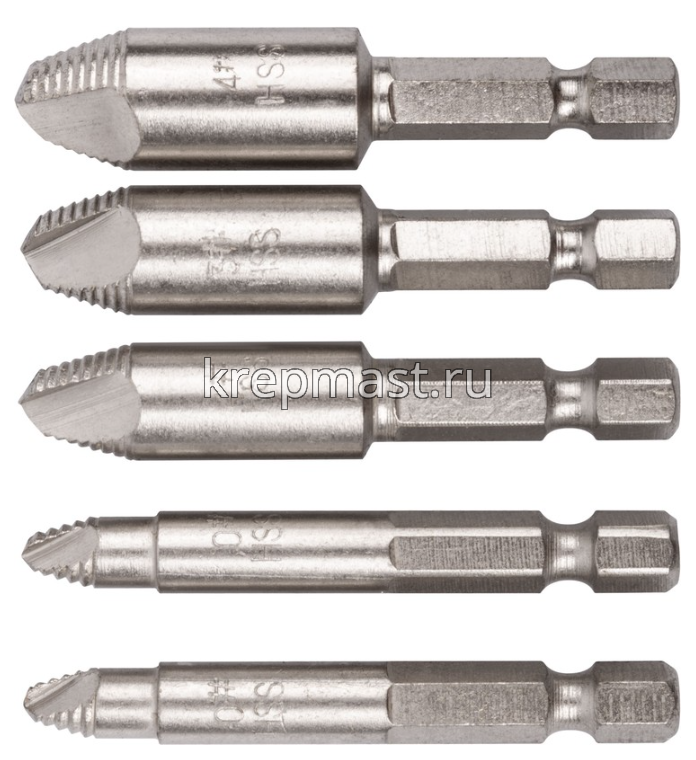 Комплект экстракторов для выкручивания болтов и шпилек применяется для демонтажа поврежденных шпилек и болтов с правой резьбой (с классом прочности не более 8.8). В комплекте представлены экстракторы универсальных размеров. Шестигранный хвостик. Материал: быстрорежущая сталь НSS. Упаковка: блистер.