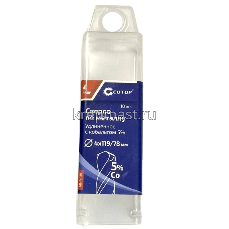 Удлиненное кобальтовое сверло по металлу М 4.0 x 119мм CUTOP изготовлено из быстрорежущей стали Р6Co5М5. Сверло шлифованное и имеет цилиндрический хвостовик. Подходит для сверления цветных металлов. Угол заточки при вершине — 135 градусов, а класс точности — А1.