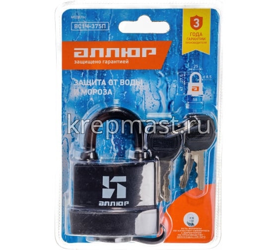 Замок навесной АЛЛЮР ВС1Ч-375П d.8,5мм водостойкий в интернет-магазине «Мастер Крепежа» по цене 646 руб. Более 10 наименований товаров в наличии в категории Замок водостойкий. Купить замок навесной аллюр вс1ч-375п d.8,5мм водостойкий в Бугульме выгодно Вы можете on-line на нашем сайте, или отправив заявку по почте, а также по телефону или в пункте выдачи компании г. Казань, ул. Татарстан, 9, магазин "Мастер Крепежа". Доставка по Республике Татарстан и другие регионы РФ.