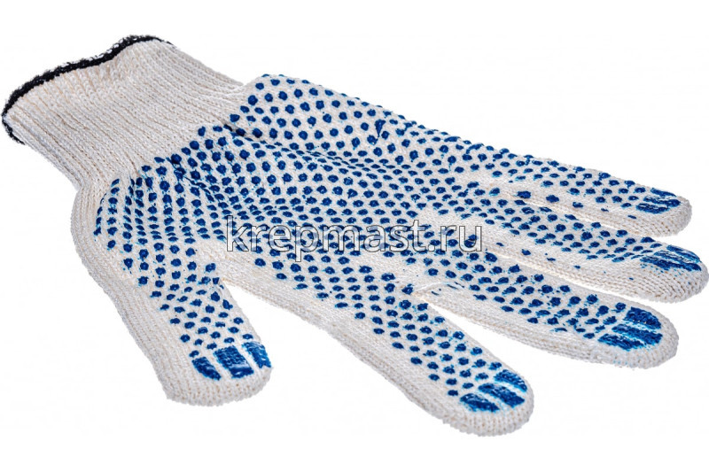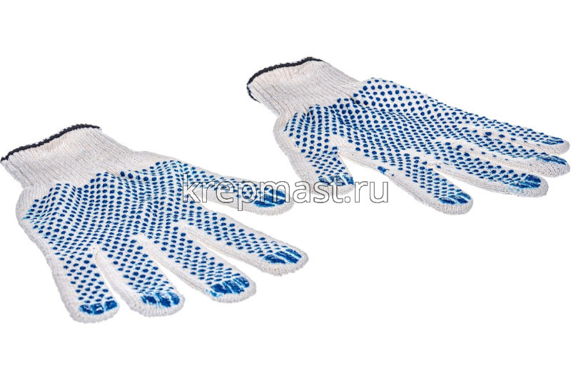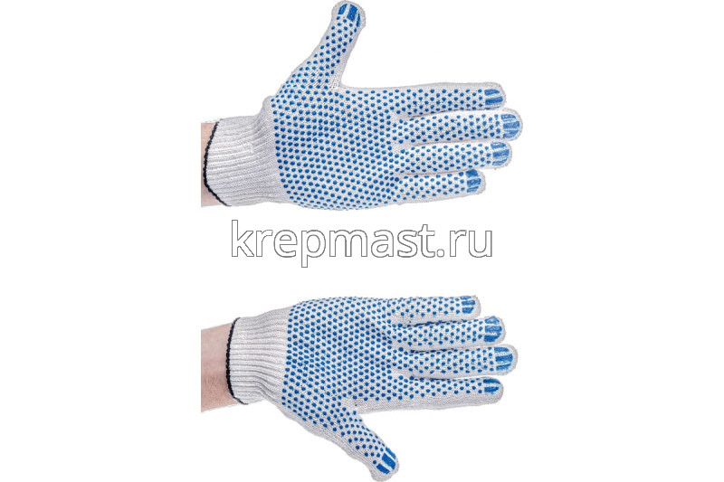 пятинитиевые перчатки выполнены из натуральной ткани. Точечное ПВХ покрытие на трехнитках на ладони препятствует выскальзыванию предметов из рук.